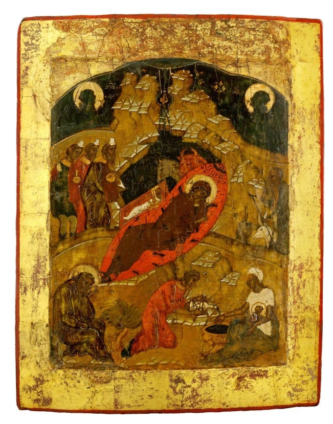 In contrast, below is a traditional icon of the same subject, the birth of Jesus, often called “The Nativity”