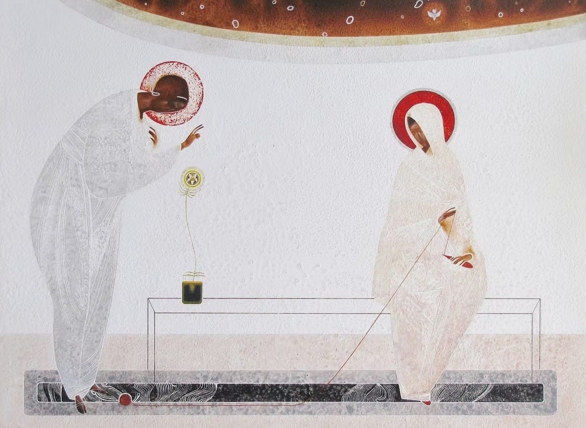The first is a traditional icon depicting the Annunciation, followed by two interpretations by Demchuk: