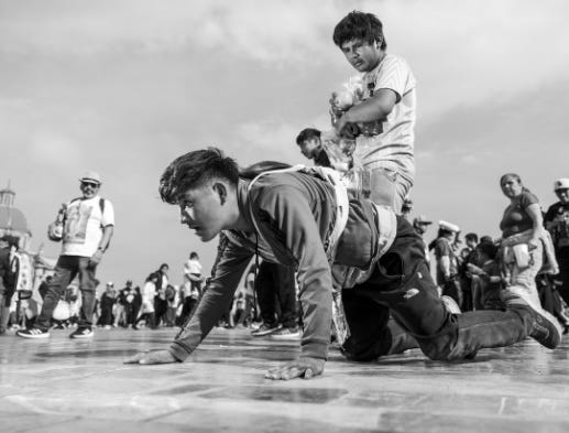 Ernesto Aguilar Morales crawls on his knees during the last two hours of his pilgrimage after 4 days of walking from Puebla. Ernesto is honoring the Virgin of Guadalupe for a miracle she performed for him—one that he will not talk about to outsiders. Photo by Kike Arnal