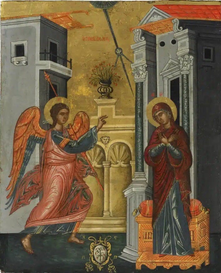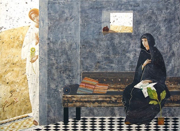 Here are three renditions of the Annunciation, the moment the angel Gabriel announces to the Virgin Mary that she is carrying the baby Jesus, son of God.